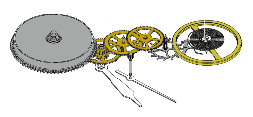 A mechanical movement uses a mainspring as a dynamic force and governs it with a balance. Using the power of the wound mainspring trying to return to its starting point, the ratchet wheel that contains the mainspring rotates, and in turn the dynamic force is conveyed to the center wheel (with the minutes' hand attached), the third wheel and the fourth wheel. The revolution of the escape wheel that is in mesh with the fourth wheel is conveyed to the pallet, and the pallet causes the balance to move left and right. The balance moves in a fixed cycle, so the pallet moves in accordance with it. The balance is the heart of the watch that holds the key to its accuracy. The pallet stops the vigorous force of the mainspring trying to return to its original state and controls the movement of the escape wheel. Also, the pallet and escape wheel are called the escapement.
