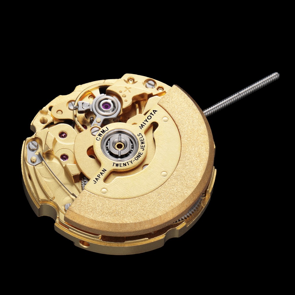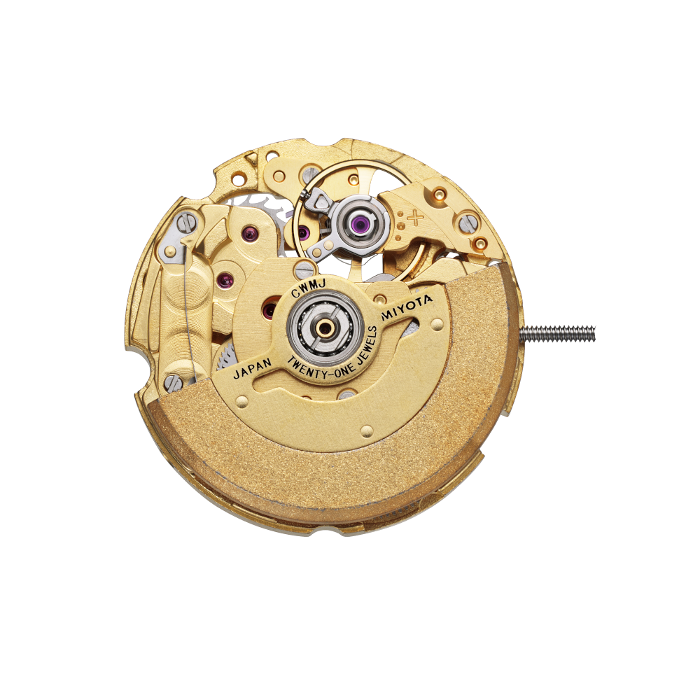 Mechanical movement perfect for small designs. The distinctive motions of the automatic movement can be enjoyed through a small window of the dial.
